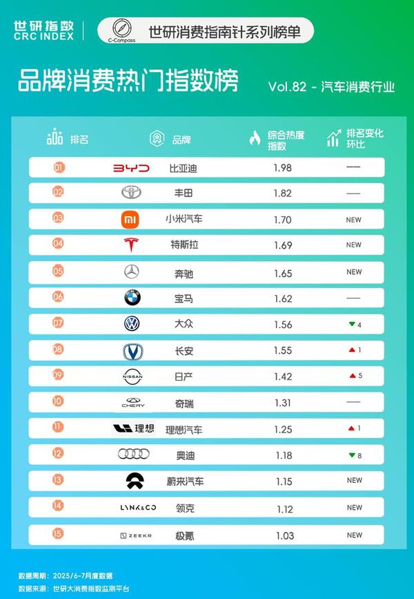 本次监测周期内,比亚迪、丰田和小米汽车分别以 1.98、1.82 和 1.70 的综合热度位列榜单前三名。 | 世研指數 | | | 世研消费指南计系列榜单 | | | | --- | --- | --- | --- | --- | --- | | | 品牌消费热门指数榜 | | | | Vol.82 - 汽车消费行业 | | 胡诗 第 | | 品牌 | 3 | 综合热度 指数 | 价 排名变化 | | 01 | CHE | 比亚迪 | | 1.98 | | | 02 | (49 | 幸田 | | 1.82 | | | 03 | ml | 小米汽车 | | 1.70 | NEW | | 04 | 7 | 特斯拉 | | 1.69 | NEW | | 05 | 3 | 奔驰 | | 1.65 | NEW | | 06 | | 章司 | | 1.62 | | | 07 | 8 | 大众 | | 1.56 | V4 | | 08 | S | 长安 | | 1.55 | ▲ 1 | | 09 | NISSAN | 日产 | | 1.42 | ▲5 | | 10 | CHENY | 育瑞 | | 1.31 | | | ...