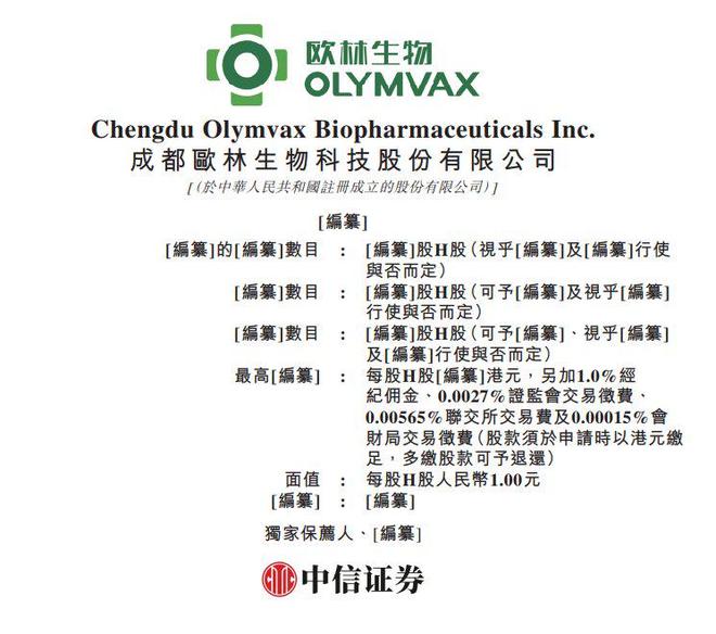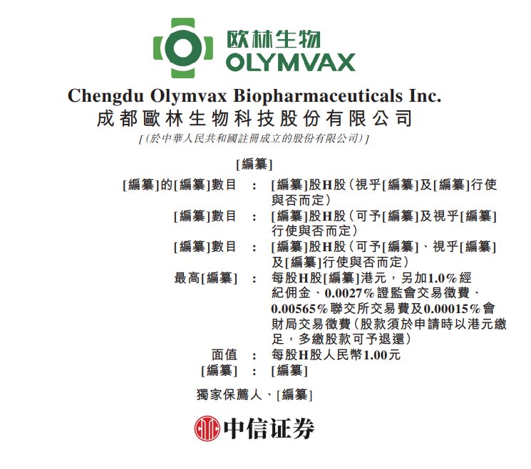 | 與合而定) | 纂]的[編纂]數目 : [編纂]股H股(視乎[編纂]及[編纂]行使 | | --- | --- | | [編纂]數目 : | [編纂]股H股(可予[編纂]及視乎[編纂] | | 行使與否而定) | | | [編纂]數目 : | [編纂]股H股(可予[編纂]·視乎[編纂] | | 及[編纂]行使與否而定) | | | 最高[编纂] : | 每股H股[編纂]港元,另加1.0%經 | | | 紀佣金、0.0027%證監會交易徵費、 | | | 0.00565%聯交所交易賽及0.00015%會 | | | 財局交易徵費(股款須於申請時以港元繳 | | 足,多繳股款可予退還) | | | 直復 : | 每股H股人民幣1.00元 | | [編纂] : [編纂] | | | 獨家保薦人·[編纂] | | 招股书显示,欧林生物是一家面向全球、创新驱动的生物制药公司,致力于创新疫苗的研究、开发、生 产及商业化。公司的战略重心聚焦于"超级细菌疫苗"及"成人疫苗"两大重大未满足医疗需求领域。与众 多尚未产生收入的生物技术公司不同,公司拥有一个成熟、强大的商业化平台,并实现三款产品的商业 化:吸附破伤风疫苗、b型 ...
