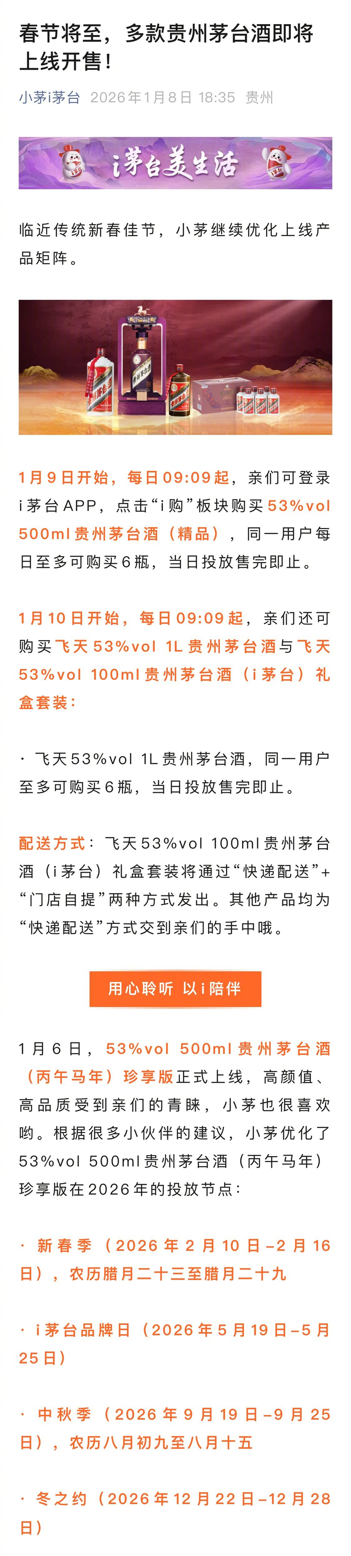 【#多款贵州茅台酒将线上开售#】1月8日小茅i茅台公众号发文:1月9日开始,每日09:09起可登录i茅台 APP,点击"i购"板块购买53%vol 500ml贵州茅台酒(精品),同一用户每日至多可购买6瓶,当日投放 售完即止。 1月10日开始,每日09:09起可购买飞天53%vol 1L贵州茅台酒与飞天53%vol 100ml贵州茅台酒(i茅台) 礼盒套装。 飞天53%vol 1L贵州茅台酒,同一用户至多可购买6瓶,当日投放售完即止。(i茅台) · 飞天53%vol 1L贵州茅台酒,同一用户 至多可购买6瓶, 当日投放售完即止。 配送方式:飞天53%vol 100ml 贵州茅台 酒(i茅台) 礼盒套装将通过"快递配送"+ "门店自提"两种方式发出。其他产品均为 "快递配送"方式交到亲们的手中哦。 用心聆听 以i陪伴 1月9日开始,每日09:09起,亲们可登录 i 茅台 APP,点击"i 购"板块购买 53%vol 500ml 贵州茅台酒(精品),同一用户每 日至多可购买6瓶,当日投放售完即止。 1月10日开始,每日09:09起,亲们还可 购买飞天53%vol 1L贵州茅台酒与飞天 53%vol 100ml 贵 ...