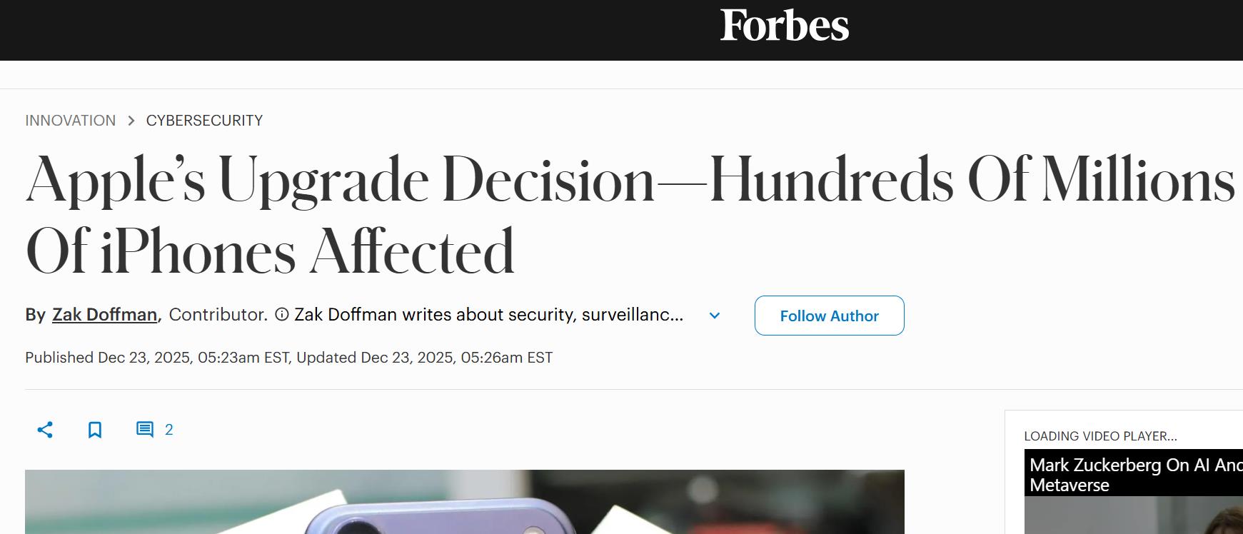 来源:环球网 【环球网科技综合报道】12月24日消息,据forbes报道称,苹果公司近日加速推进其系统升级策略,要求所有iPhone 11及更新机型用户立即从iOS 18迁移至 iOS 26,此举将直接影响全球数亿设备用户。这一决定源于近期确认的多起针对iPhone的高级持续性威胁(APT)攻击。 据科技媒体9to5Mac援引苹果惯例预测,下一版本iOS 26.3有望于2026年1月下旬发布,最可能日期为1月26日(星期一),也可能延后至当周次日。该版本 预计将包含常规安全漏洞修补。(青云) 根据苹果最新披露的信息,原本计划作为广泛适用修复版本的iOS 18.7.3,现已调整为仅支持iPhone XS、XS Max和XR等特定机型。这意味着更广泛的用户 群体——尤其是使用iPhone 11及后续型号的用户——无法再通过iOS 18系列获得关键安全补丁,必须升级至iOS 26才能获取最新防护。 尽管iOS 26已于今年早些时候正式发布,但用户采纳率仍不理想。据第三方分析师综合数据显示,目前至少有50%的兼容设备尚未完成升级,而仍在运行不 符合升级条件旧机型的用户比例低于10%。低升级意愿可能受存储空间限制、对新 ...