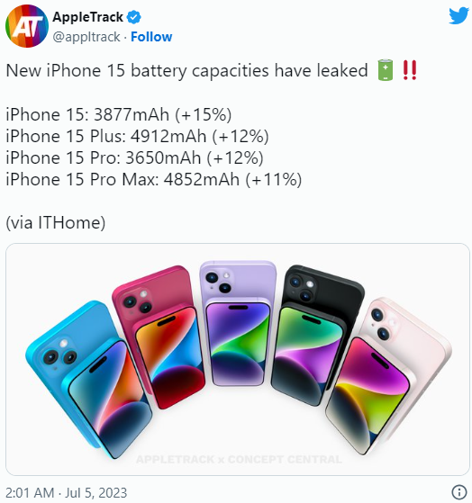 据报道,苹果iPhone 15系列的续航时间将会延长11%至15%不等。 据悉,基本款iPhone 15的续航时间可能延长15%,iPhone 15 Plus/Pro延长12%,iPhone 15 Pro Max则是 11%。 增加续航后,这四款手机的电池分别为3877mAh、4912mAh、3650 mAh和4852mAh。 科技视频博主Jacklyn Dallas表示,与软件开发方面相比,目前智能手机在硬件上的提升不是很明显—— 虽然屏幕、相机素质都越来越好,但是续航还是顶多撑一天。 "屏幕时间变得更好,相机也变得更好,但智能手机实际上仍然只能维持一天,因此容量的增加确实是 一件好事,"她说。 她认为,此次更新最多让续航稍有提升,且不会对苹果定价产生太大影响。 ...