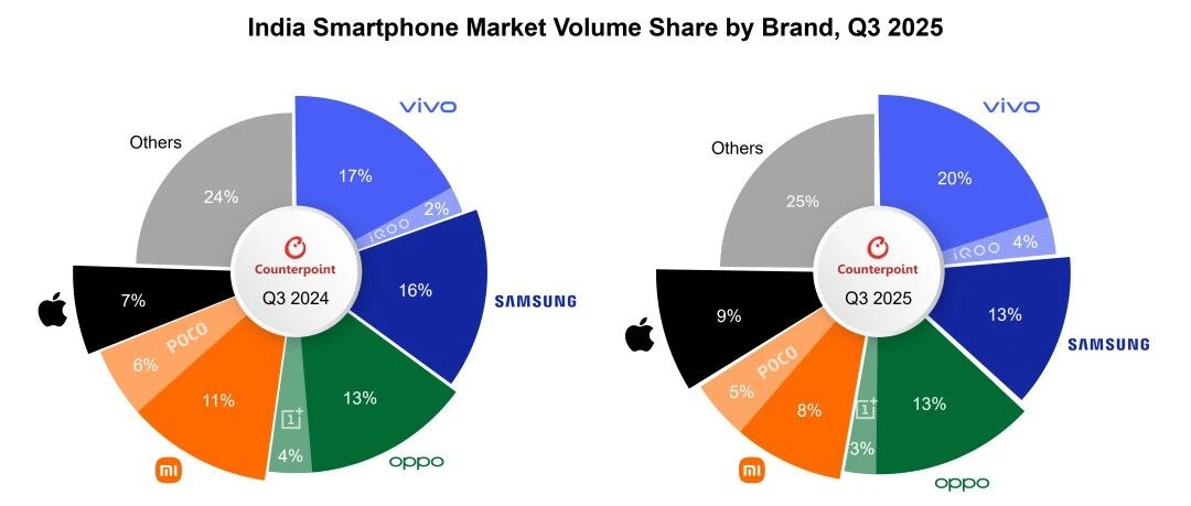 近日,根据市场调研机构Counterpoint Research最新数据显示,2025年第三季度中国智能手机市场销量同比下滑2.7%。 其中,苹果公司的市占率为13.6%,在主流厂商中排名第六,未能进入前五名。值得关注的是,这是苹果在中国市场连续多个季度面临增长压力。 早在今年第一季度,Counterpoint的数据就显示其销量仅980万台,市场份额13.7%,同比降幅达9%。从一季度到三季度,销量下滑幅度虽有所收窄,但市占 率的持续走低。 据Counterpoint高级分析师Mengmeng Zhang透露,iPhone 17基本款在中国的销量几乎达到去年同期iPhone 16的两倍。进入10月份后,iPhone 17 Pro的同比增 长率比去年的iPhone 16 Pro高出近三分之二。 但从销量数据来看,在iPhone 17的热潮下,苹果在第三季度的销量仍同比下滑2%。这一表现与市场整体下滑趋势基本保持一致,但与其他主要厂商相比, 苹果的增长动力稍显不足。 值得一提的是,苹果财报数据显示,第四财季大中华区营收为144.93亿美元,较上年同期的150.33亿美元下降3.6%,成为其全球各区域中唯一营收下滑 ...