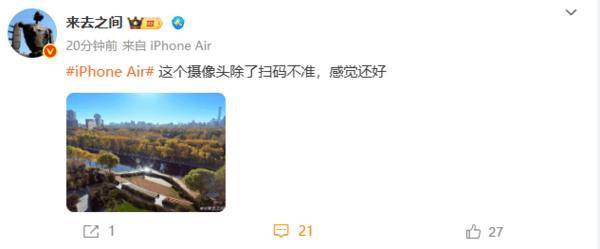 微博CEO评iPhone Air拍照:除了扫码不准 其余还好