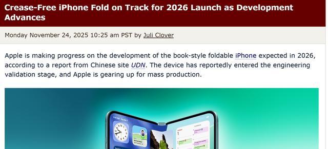 来源:环球网 【环球网科技综合报道】11月25日消息,据MacRumors报道,苹果公司在折叠屏手机研发领域取得关键 进展,其首款折叠屏手机iPhone Fold成功攻克行业核心痛点,实现无折痕设计,有望成为全球首款真正 意义上的无折痕折叠手机。该技术突破将为其明年正式上市奠定坚实基础,进一步丰富高端折叠屏市场 供给。 据供应链透露,苹果此次在折叠屏技术上的突破,核心在于屏幕与铰链系统的创新整合。这款iPhone Fold的内屏幕由三星独家供应,但面板结构设计、材料处理制程及叠层压合工艺均由苹果主导研发。为 解决传统折叠机普遍存在的屏幕折痕问题,苹果联合新日兴、安费诺两家核心供应商共同开发关键零组 件轴承,通过优化面板与轴承的适配逻辑,从根本上避免了屏幕中间出现永久性折痕的行业难题。 在铰链技术方面,苹果与合作伙伴成功掌握了液态金属打造高强度铰链组件的核心技术。液态金属材料 具备低变形、高韧性的优良特质,不仅能大幅提升折叠屏手机的折叠耐久度,延长产品使用寿命,还能 保持机身握持时的细腻手感,兼顾实用性与体验感。 值得关注的是,供应链相关布局已同步推进。鸿海集团已专门搭建折叠iPhone专属生产线,这标志着该 ...