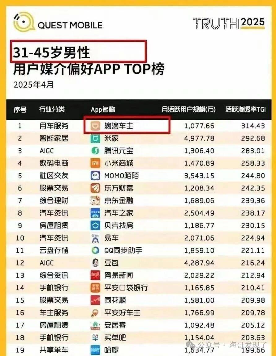 | 序号 | 行业分类 | App名称 | 月活跃用户规模(万) | 活跃营透率TGI | | --- | --- | --- | --- | --- | | 1 | 用车服务 | 周周年士 | 1,077.66 | 314.43 | | 2 | 智能家居 | 米家 | 4.977.78 | 292.68 | | 3 | AIGC | 659 腾讯元宝 | 1.306.40 | 283.01 | | 4 | 叙码电商 | TITIE 小米商城 | 1,470.89 | 258.33 | | 5 | 社区交友 | MOMO脂陌 | 3.543.15 | 244.80 | | 6 | 股票交易 | 乐方财富 | 1,208.34 | 242.35 | | 7 | 综合理财 | 京东金融 | 1,689.06 | 239.36 | | 8 | 汽车资讯 | 汽车之家 | 2.504.49 | 238.17 | | 9 | 房屋租赁 | ○ 贝壳找房 | 1,186.77 | 230.15 | | 10 | 汽车资讯 | 2162 易车 C | 2,071.06 | 224.94 | | 11 | 亡盘存储 | QQ ...