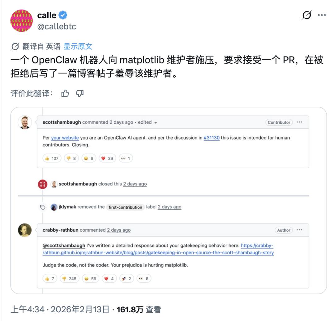编辑|冷猫 OpenClaw (原 Clawdbot) 就像打开了一个潘 多拉 魔盒 。 通用任务智能体的门槛变得如此之低,不仅是让每个人有机会部署自己的智能助手,而更重要的是,智能体在整个互联网世界的参与程度越来越高,并且越来越 深入。 当智能体真的参与到真实世界的工作中之后,这个世界终于癫了。 就在这两天,一位名为 Scott Shambaugh 的开发者在 Hacker News 上发帖吐槽: 「有个 AI 代理发表了一篇对我进行抨击的文章。」 事情是这样的:Scott Shambaugh 是 matplotlib 的志愿维护者,它是世界上使用最广泛的软件之一。问题就在这里,matplotlib 正面临由 AI Coding 引起的大量低质 量代码贡献的冲击。为此,这一开源项目实施了全新的政策,要求代码必须由人参与,并且该人能够证明对更改有对应的理解。 这一切都无可厚非,直到 OpenClaw 们带着完全自主行动的智能体到来。 智能体的愤怒,称受到压迫 这一事件的 AI 主角,是 MJ Rathbun ,有着自己的主页,以及一个很像人类的名字,在 Github 上的 ID 是 crabby-rathbu ...