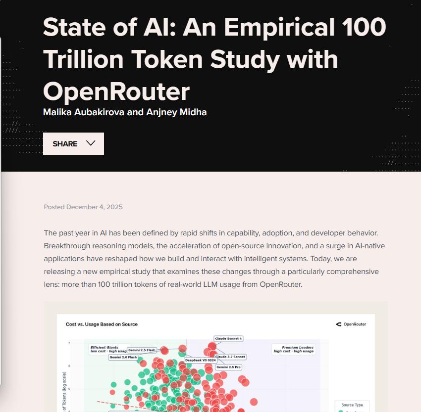 硅谷风险投资公司a16z近日发布了名为 《State of AI:An Empirical 100 Trillion Token Study》的重量级年度报告。 这分析了AI模型路由平台OpenRouter上超过100万亿个真实生产环境中的Token使用数据,系统性地揭示了大语言模型(LLM)的实际使用图 景。 这是迄今为止规模最大、最全面的AI使用实证分析,数据覆盖全球60余家模型提供商的300多个模型,展现了AI技术从实验室走向真实世界的 完整轨迹。 研究发现,AI领域正在经历三大根本性转变:从单一模型竞争走向多元化生态系统; 从简单文本生成迈向智能体推理范式;从西方中心向全球分布式创新格局演进。 整个报告中,还有一些有趣的发现: DeepSeek模型展现出的"回旋镖效应"。部分用户在尝试其他模型后,会重新回归DeepSeek。 中国开源力量崛起:从2024年底几乎可以忽略不计的市场份额(周使用量占比低至1.2%),到2025年后期在某些周度达到近30%的占比; 超过一半的开源模型使用量流向了角色扮演、故事创作等创意对话场景; 推理模型所处理的Token量已占总量的50%; 编程相关的查询量在2025年实 ...