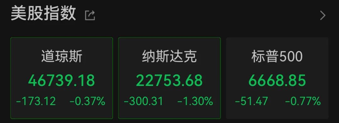 当地时间周五,美股三大指数集体低开。截至发稿,道琼斯指数跌0.37%,标普500指数跌0.77%,纳斯达克综合指数跌1.30%。 大型科技股普跌,特斯拉、英伟达、甲骨文均跌超3%。 费城半导体指数跌至两周多以来的最低点,跌幅达2.61%。 | < 日 | | | 费城半导体指数(SOX) | | Q | | --- | --- | --- | --- | --- | --- | | | | | 11-07 10:08:29 | | | | 6835.32 | | 昨收 | 7018.39 | 成交额 | 0 | | -183.07 -2.61% | | 今开 | 6917.75 | 成交量 | O | | 上 涨 | 1 | 中 日 | 0 | 下 跌 | 29 | | 最高价 | 6925.42 | 市盈率 | 48.7 | 近20日 | 6.68% | | 最低价 | 6788.06 | 市净率 | 13.48 | 今年来 | 37.26% | | 分时 | 五日 日K | | 周K | 月K 更多 @ | | | 量加 | | | | | | | 7248.72 | | | | | 3.28% | | ...