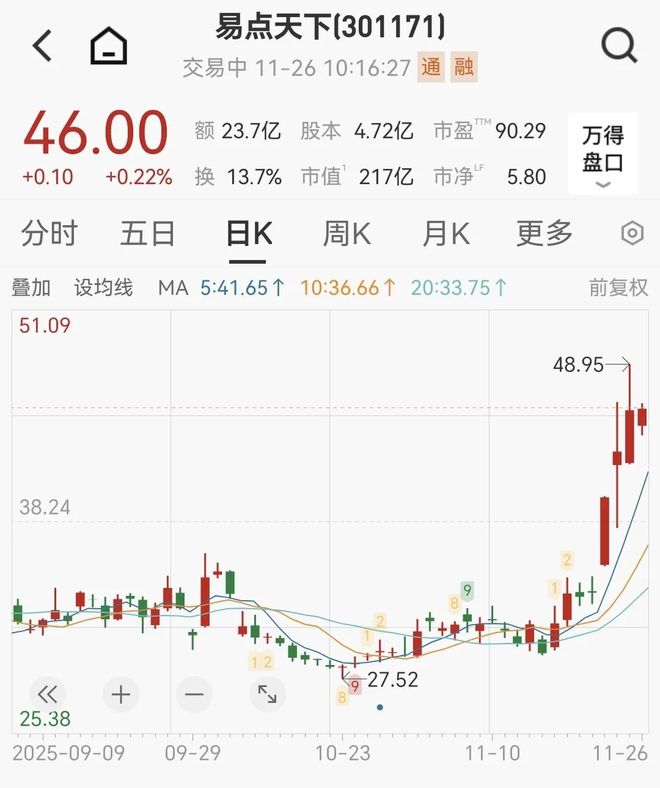 记者丨凌晨 编辑丨朱益民 谷歌Gemini 3.0发布不足一月,资本市场已迅速划出一道从技术突破到概念落地的传导链。 在这条链上,易点天下(301171.SZ)成为关键一环——其股价在数个交易日内大幅拉升,总市值突破 216亿元,市场用真金白银投票,认可了一家"卖水人"的AI内容价值。 然而高光之下亦有暗影。就在股价异动期间,公司主要股东悄然减持。这一动作与靓丽的三季报形成微 妙对照:一边是营收同比增长超50%、电商业务翻倍的高增长叙事,一边是股东在高点兑现的现实选 择。 易点天下所面临的,已不仅是业绩能否持续的考验,更是其能否真正从"营销服务商"跃迁至"AIGC出海 基座"的价值重估大考。 11月25日,易点天下股价收盘上涨6.55%,在近两周的时间内,累计涨幅高达50.77%。 Gemini 3.0催化市场行情 Google Cloud AI GTM专家孟和指出,AI技术快速迭代下,当前大模型的能力边界,从故事内核生成到 高质量视听呈现,均已具备超乎想象的落地潜力,随着多模态模型的发布,技术已不再是瓶颈。 技术的关键突破,正悄然重构数字内容的生产链条。风口之上,资本正试图捕捉那些能将技术势能转化 为商业动 ...